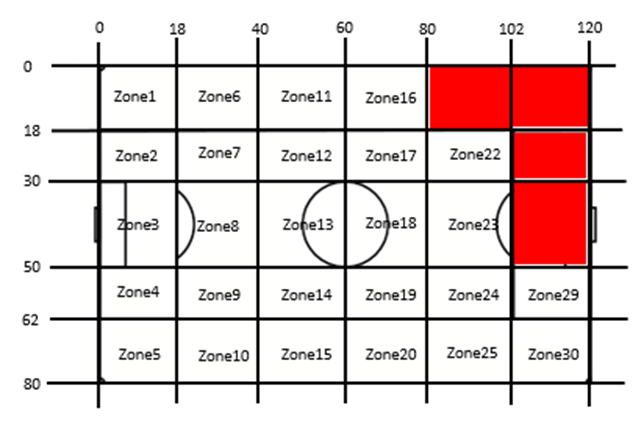 Analysing the coordinates of each event independently would not provide any insights due to the huge variety of combinations for X and Y. Hence, each event has been labelled with the zone in which it occurred, which would be determined by the X and Y values of the event. Figure 1 outlines the zones in which the pitch was split. The zones split the pitch into 6 laterally in order to break down the opposition half into 3rds and into 5 longitudinally in order to include the half spaces which have become popular in modern football.