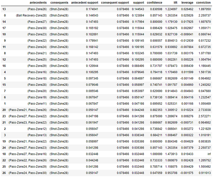 Figure 5 serves as a confirmation of what was observed earlier. Out of all shots, Pass-Zone26 -> Shot-Zone28 have been featured together 14.5% of the time whilst Pass-Zone26 alone has been featured 17.4%, which is a considerable amount, given the variability of event and zone combinations. The relationship is further confirmed by the lift and conviction values. The same conclusion can be observed for Ball Recovery-Zone28 -> Shot-Zone28 and Pass-Zone27 -> Shot-Zone28 both of those relationships have been featured more than 10% of the total shots (12.3% and 11.7% respectively) and have a high confidence which consequently leads to higher lift and conviction values. Further down it can be seen that the relationship Pass-Zone16 -> Shot-Zone28 also has favourable values, however it has been present only 7.9% of the time and with a confidence of less than 80% it can be overlooked. A potential chain of events is formed with the relationship between Pass-Zone21,Pass-Zone26 -> Shot-Zone28, Pass-Zone27,Pass-Zone23 -> Shot-Zone28 and Pass-Zone27,Pass-Zone22 -> Shot-Zone28. All of those relationships have low support, however when they are present together they almost always lead to a shot in zone 28 as indicated by the high confidence.