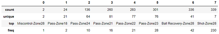 This number has been established on a trial and error basis. Trying with less number of events serves the concern of not catching too little of the teams sequence and on the contrary using too many can result in including events which are distant from each other with respect to time. It is important to note that the events being considered before the shot are not only for Chelsea. Instead all 10 events irrespective of the team have been included and then the ones which occurred for Chelsea have been selected. This further protects against the scenario where the opposition has been in possession for a considerable amount of time before a shot and the events selected are not latter part of the event sequence is not actually linked to the shot.