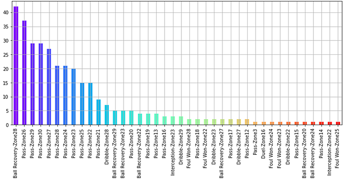 Figure 2 is showing that the maximum amount of events present in an itemset is 8. However, as we can see the event chain has included 8 events only on 2 occasions (see [0]) and 7 events on 24 occasions (see [1]) which would already give an indication that long build ups before a shot are not a regular occurrence. On the other side, it can be seen that the most frequent outcome from a sequence is a Shot in Zone 28 which is to be expected given that it is the most dangerous area of the pitch. From Figure 4 we can already start getting an idea of what the preferred way for Chelsea to get a shot is, with the most frequent event being a ball recovery in zone 28 and a pass from zone 26.