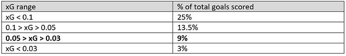 StatsBomb have an xG metric which indicates how likely it is for the shot to result in a goal. That metric will be used to filter only the shots which can be considered a threat on goal. Looking at the numbers, 25% of the goals that Chelsea have scored have an xG of less than 0.1 which is a considerable amount to be left out. Table 1 represents the percentage of goals scored within an xG range. Based on that a decision has been made to use an xG > 0.03 as a threshold for shots to be considered